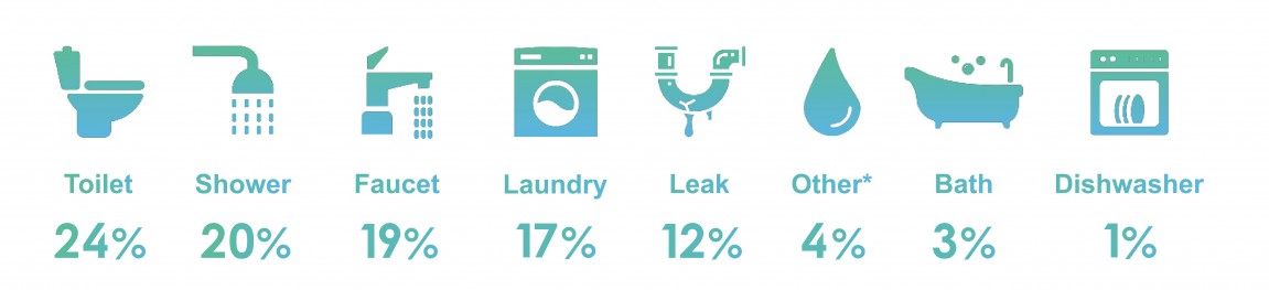 First, it’s good to understand where most of our water consumption comes from. The average household in the United States uses more than 300 gallons per day, about 70% is indoor use (water from the tap, toilet, and appliances) and 30% is outdoor use (water for keeping that lawn impeccably green, or for washing cars). Indoor water use in a typical household looks like this: